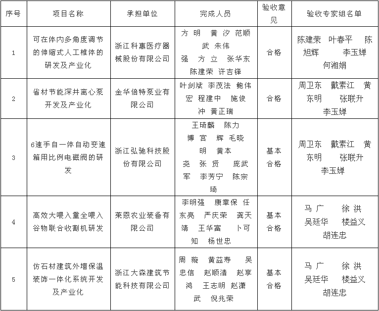 根據《金華市級科技計劃項目驗收管理辦法》(金市科字〔2015〕83號)規定,現將浙江科惠醫療器械股份有限公司、金華倍特泵業有限公司、浙江弘馳科技股份有限公司、萊恩農業裝備有限公司、浙江大森建筑節能科技有限公司承擔的《可在體內多角度調節的伸縮式人工椎體的研發及產業化》、《省材節能深井離心泵開發及產業化》、《6速手自一體自動變速箱用比例電磁閥的研發》、《高效大喂入量全喂入谷物聯合收割機研發》、《仿石材建筑外墻保溫裝飾一體化系統開發及產業化》5個市級科技計劃項目驗收結果予以公示,接受社會監督,公示期從2017年9月26日至10月8日止。任何單位和個人對驗收意見持有異議的,應當在公示期內書面向市科技局提出異議,單位應采用書面形式并加蓋公章,個人應采用實名提出異議。