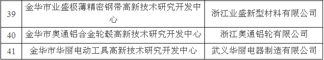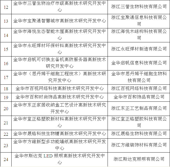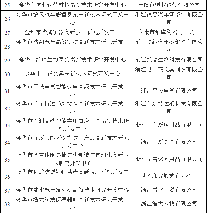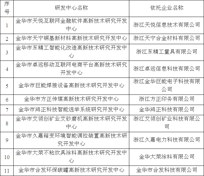 金華市級高新技術研究開發中心名單