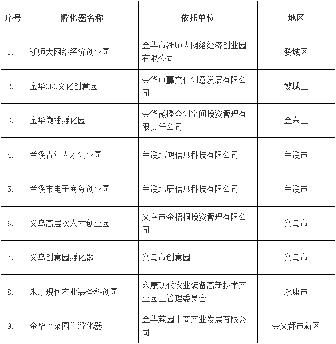 根據《金華市級科技孵化器認定與管理辦法》(金市科字〔2010〕66號)規定,我局組織開展了2018年第一批科技孵化器的認定工作,經縣(市、區)推薦、業務處室審核及專家評審,現將擬認定的9家科技孵化器予以公示,接受社會監督。
