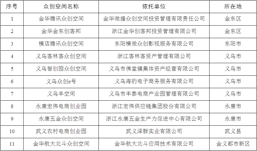 根據《金華市眾創空間管理辦法(試行)》(金市科〔2016〕70號)規定,經研究,同意金華騰訊眾創空間等11家單位備案為金華市眾創空間。