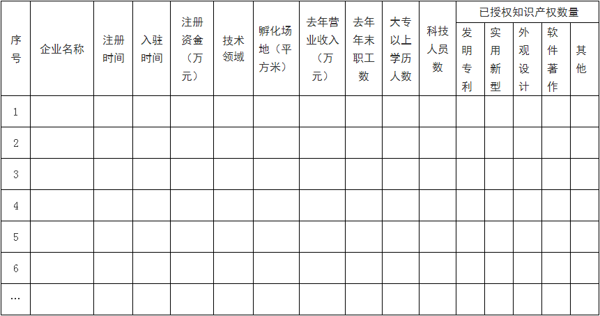 (六)在孵企業情況(在孵企業情況匯總表、在孵企業與孵化器簽署的孵化服務協議或入駐協議);