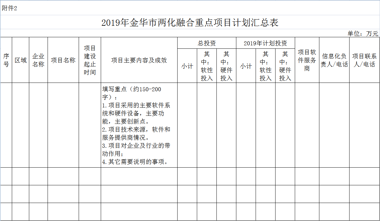 (三)請各地認真組織,動員企業積極申報。由申報企業按《金華市信息化和工業化融合重點項目管理辦法》要求填報《2019年金華市兩化融合重點項目申報表》(附件1)和《2019年金華市兩化融合重點項目計劃匯總表》(附件2),連同有關資料裝訂成冊(雙面打?。?;由各地經信部門匯總《2019年金華市兩化融合重點項目計劃匯總表》(附件2)。書面申報材料份(另需提供電子文檔),530報送我局。